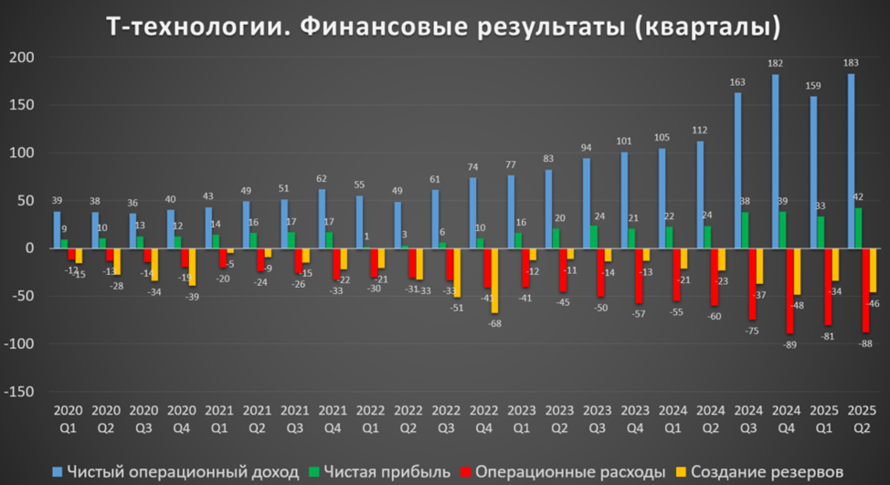 Результаты 2Q 2025 значительно лучше г/г. Но на диаграмме видно, что результаты резко подскочили именно с Q3 2024 после присоединения Росбанка. С тех пор темпы роста упали и можно сказать, что стабилизировались. Правда, именно в последнем квартале был немного обновлен рекорд по ЧОД и ЧП.