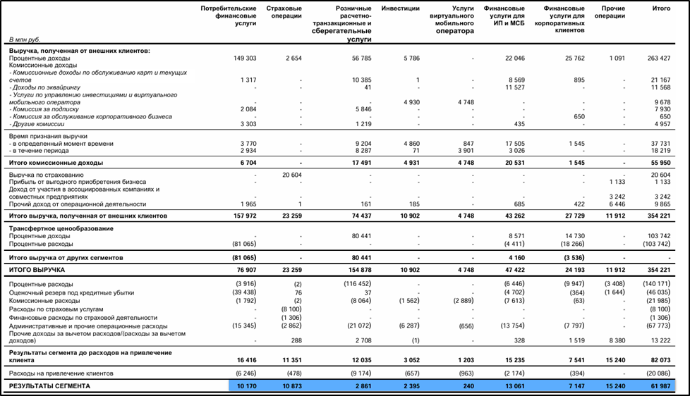 Сегментный анализ показывает, что большую часть прибыли приносят банковские услуги и страхование. Примерно 21% прибыли до налогообложения приходится на розницу и 34% на финансовые услуги для малого, среднего бизнеса и корпоративных клиентов. Страхование около 18%, «Инвестиции» 4% прибыли. Мобильные услуги в районе ноля.