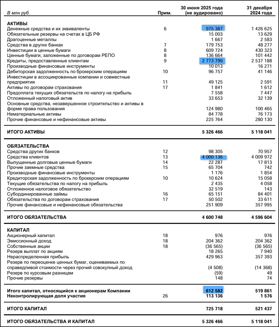 После присоединения Росбанка существенно вырос Капитал Группы. По этой же причине в прошлом году Группа отразила резкий скачок кредитного портфеля и средств клиентов. Но за 1П 2025 темпы роста бизнеса нормализовались.