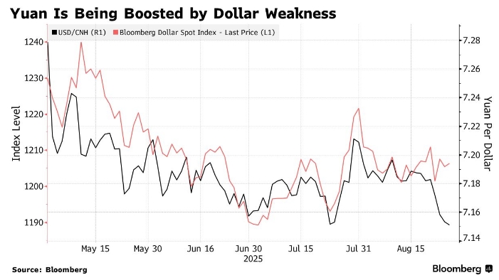 Инвесторы настроены оптимистично в ожидании устойчивого роста акций перед парадом в честь Дня Победы 3 сентября, что способствует притоку капитала и укреплению юаня. Доллар снизился после того, как на прошлой неделе глава Федеральной резервной системы США Джером Пауэлл в Джексон-Хоуле намекнул на возможное снижение процентной ставки уже в сентябре.