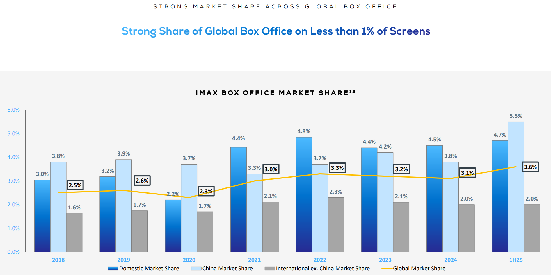 На данный момент глобальная доля IMAX в кассовых сборах составляет 3,6%. В США и Канаде показатель восстанавливается после слабого 2023 года и достиг 4,7% в 1-м полугодии 2025 года, а на ключевом китайском рынке вырос до 5,5% против 3,8% годом ранее.