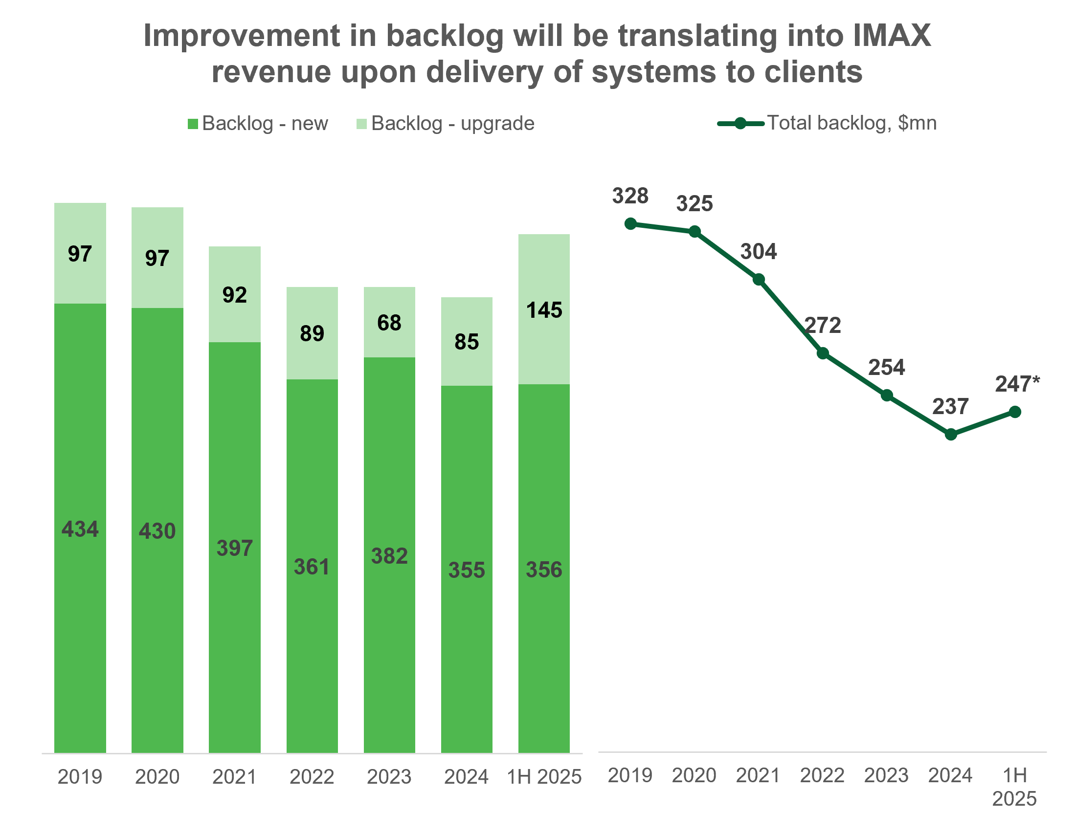 Наш инвестиционный тезис подтверждается устойчивым ростом бэклога IMAX: на конец 2024 года портфель заказов компании составлял 440 систем, а уже через полгода увеличился до 501, добавив 61 систему. Хотя основная часть прироста пришлась на модернизацию существующих площадок, мы ожидаем, что этот импульс приведёт и к новым заказам, поскольку насыщенный график премьер подталкивает владельцев кинотеатров инвестировать в премиальные технологии.