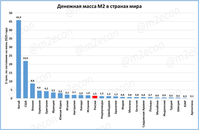 Денежная масса (рейтинг стран). Лидирует с большим отрывом Китай, на втором месте США, на третьем месте Еврозона. Россия, в зависимости от метода подсчёта, на 9-12 месте.