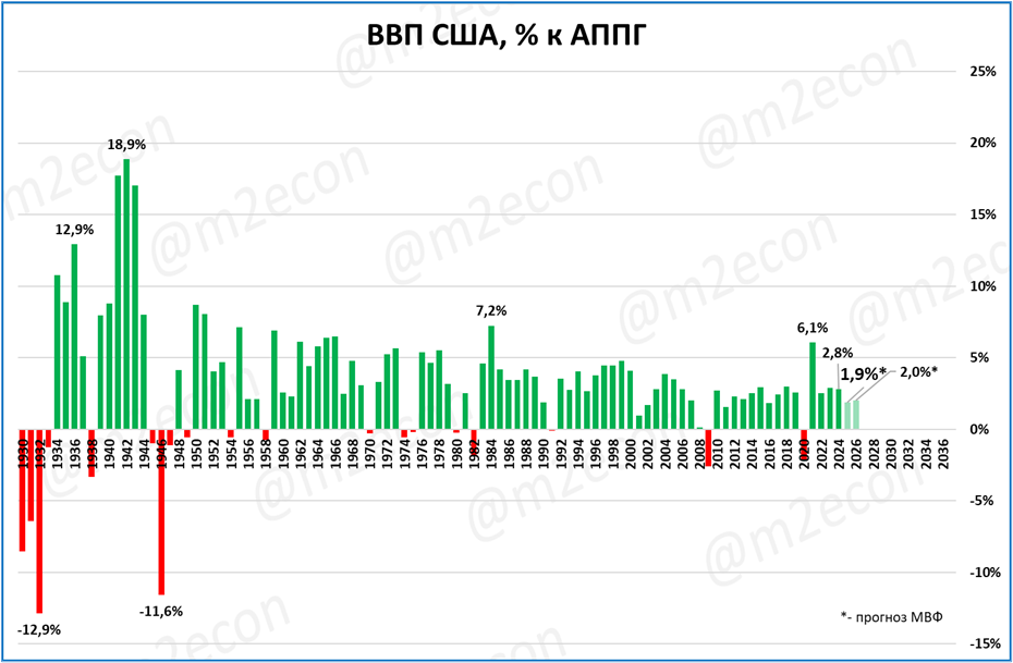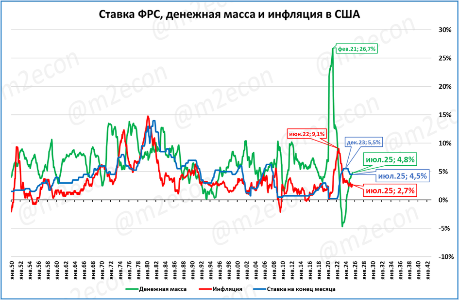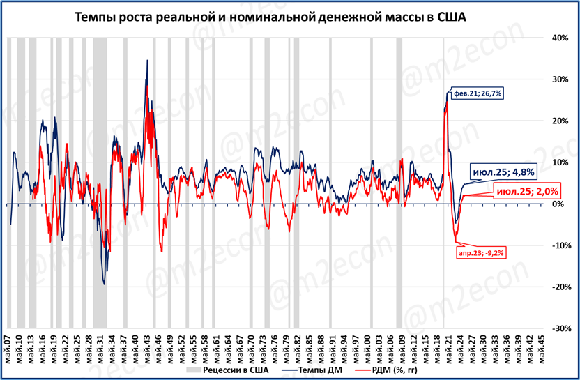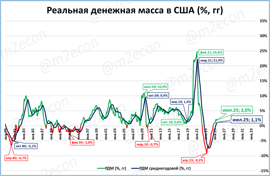 Реальная денежная масса США продолжает расти и в июле составила 2,0%. Прирост ВВП США составил 1,9% к аналогичному периоду 2024 года.