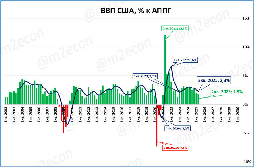 30 июля вышли данные по ВВП США за второй квартал 2025 года. Темп прироста составил 1,9% (к соответствующему кварталу прошлого года).