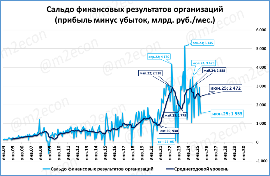 Прибыль предприятий в июне: +1,55 трлн. рублей. Среднегодовая прибыль сейчас опустилась на уровень многолетнего тренда, но остаётся выше периода 2000-2021 годов.