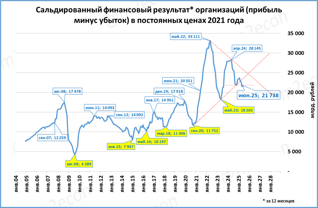 Реальная прибыль за 12 месяцев (скользящий год) составляет порядка 21,7 трлн в ценах 2021 года.