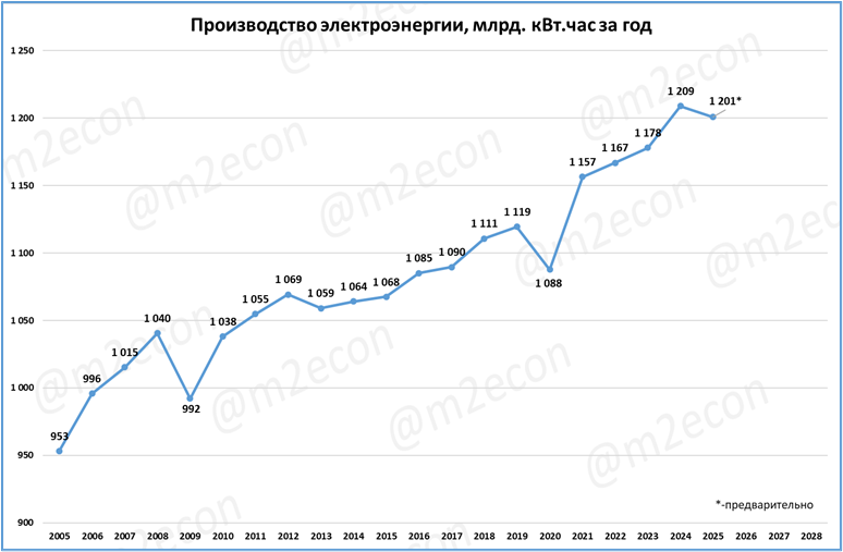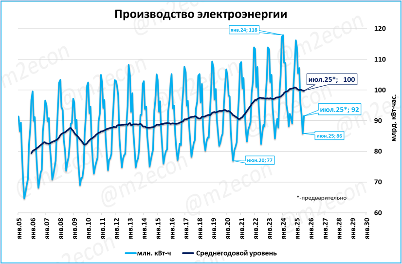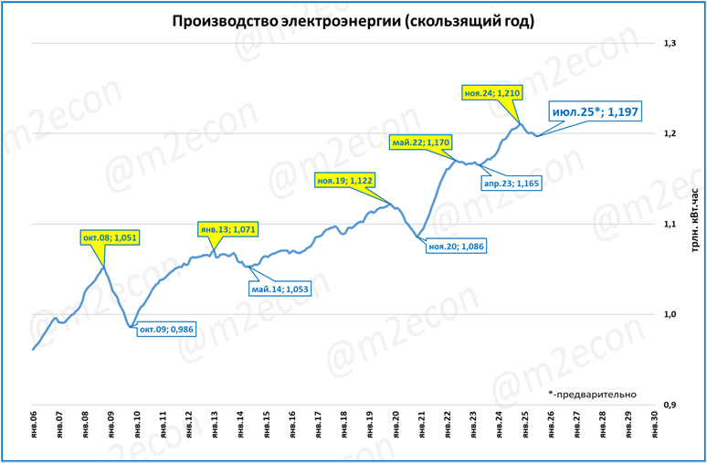 Несмотря на снижение, уровень производства остаётся достаточно высоким, порядка 1,2 трлн. кВт часов. Напомним, что этот уровень впервые в истории был достигнут лишь в июне 2024 года.