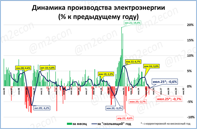 *Необходимо учитывать, что Росстат перешёл от статистики «без учёта новых регионов» к статистике «всего по РФ», которая, видимо, учитывает производство электроэнергии в новых регионах. Но длинного ряда в новом формате пока нет. Динамика, которую приводит Росстат говорит о падении в июле на 1,3% к июлю прошлого года.