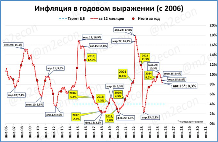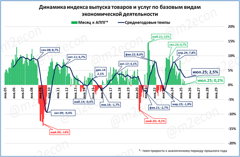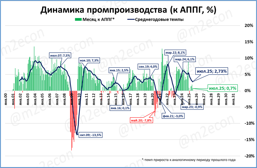 Промпроизводство (это около 30% ВВП) в июле выросло на 0,7% к июлю 2024 года. Выпуск базовых отраслей (это около 60% ВВП) вырос на символические 0,2% к июлю прошлого года. Экономика замедляется.