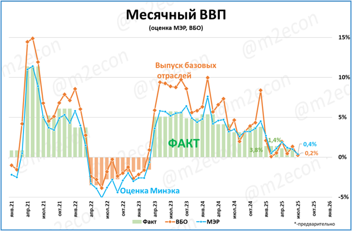 Росстат даёт только квартальные оценки ВВП. Но МЭР на основе данных по ВБО (см. выше) пробует давать свою месячную оценку ВВП.