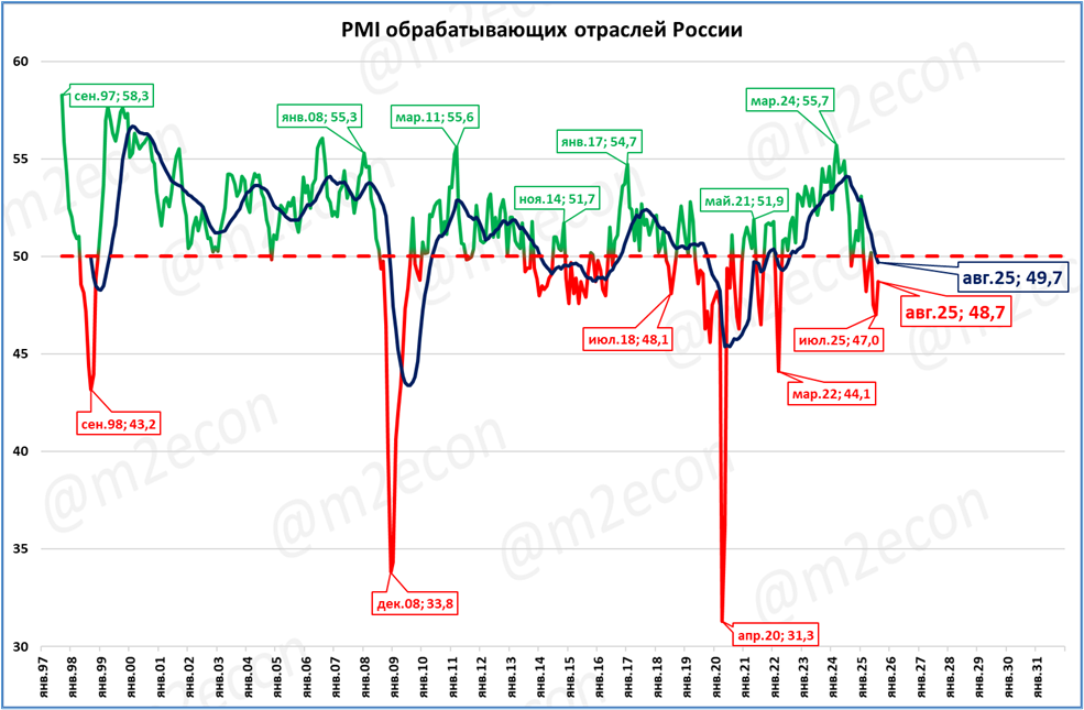 Индекс деловой активности в обрабатывающей промышленности России, составил в августе 48,7 пункта, это ниже 50 пунктов указывает на спад.