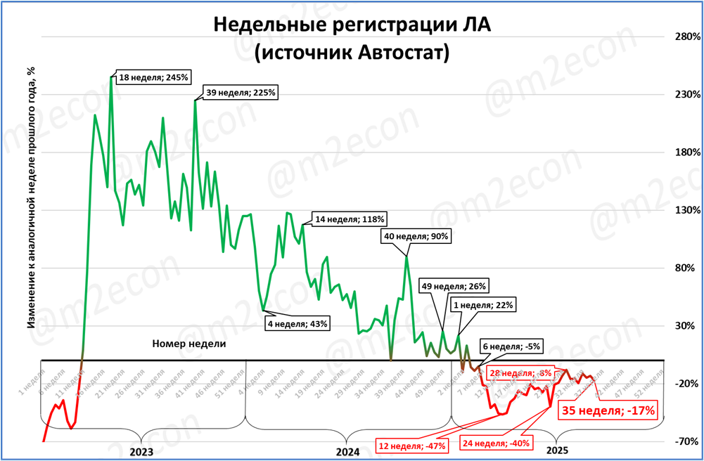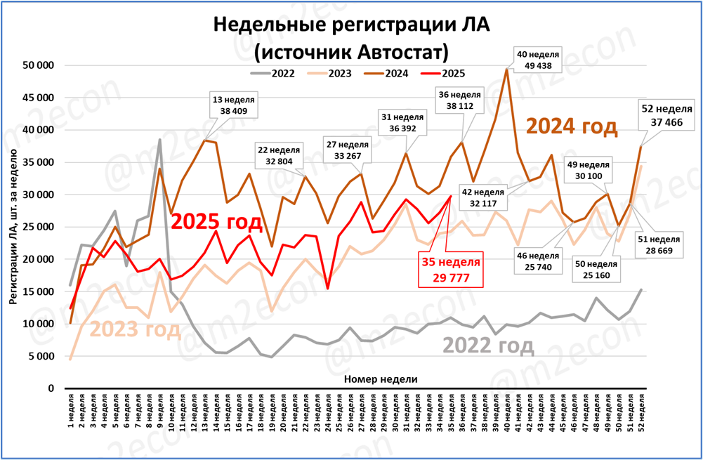 По данным агентства «Автостат», регистрации легковых автомобилей на 35 неделе составили 29,8 тыс. — это лучшая неделя 2025 года.