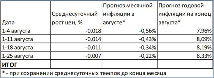 С 1 по 25 августа, среднесуточная динамика цен составила -0,007%. Инфляция по итогам августа может снизиться до 8,3% годовых.