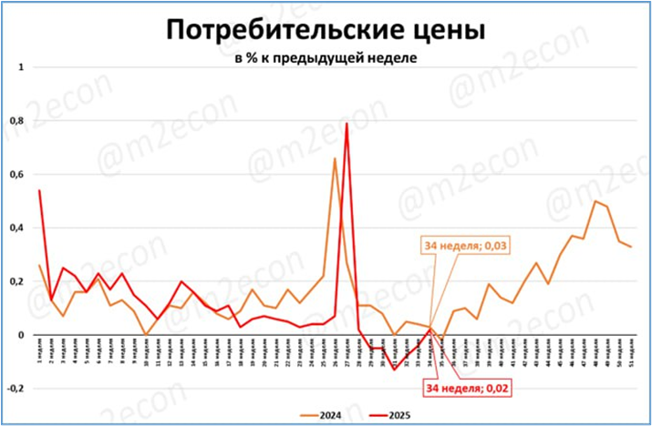 Инфляция на 34-й неделе прошлого года была 0,03%. На 33 неделе этого года цены выросли на 0,02%.