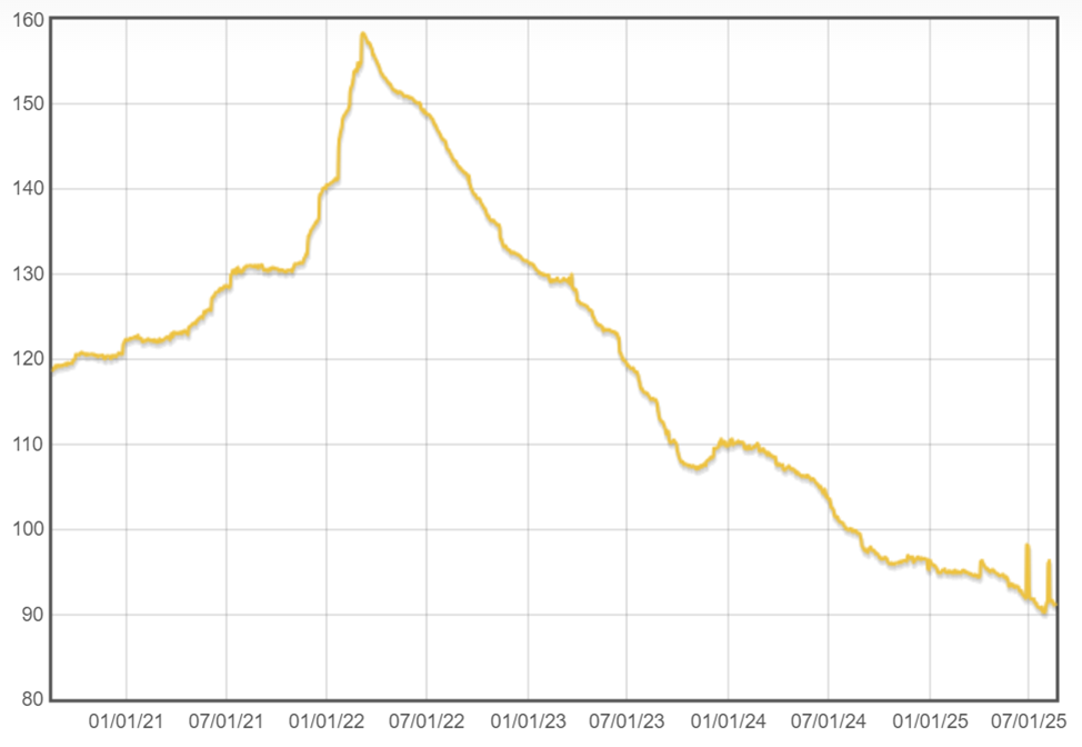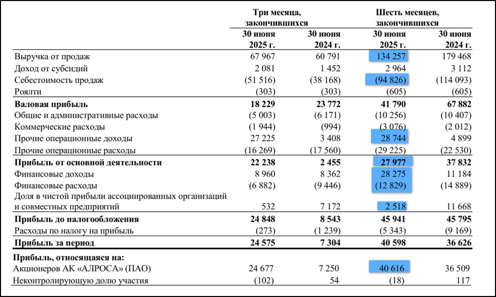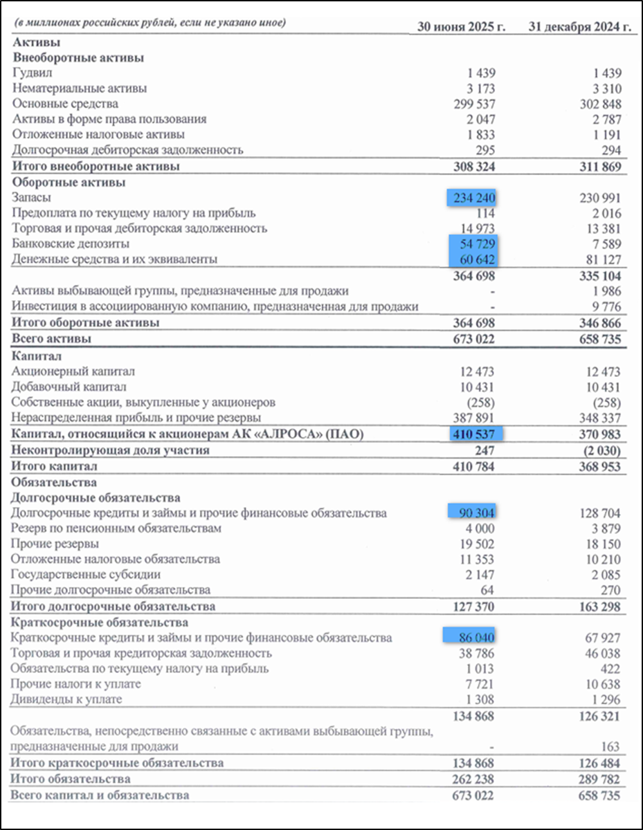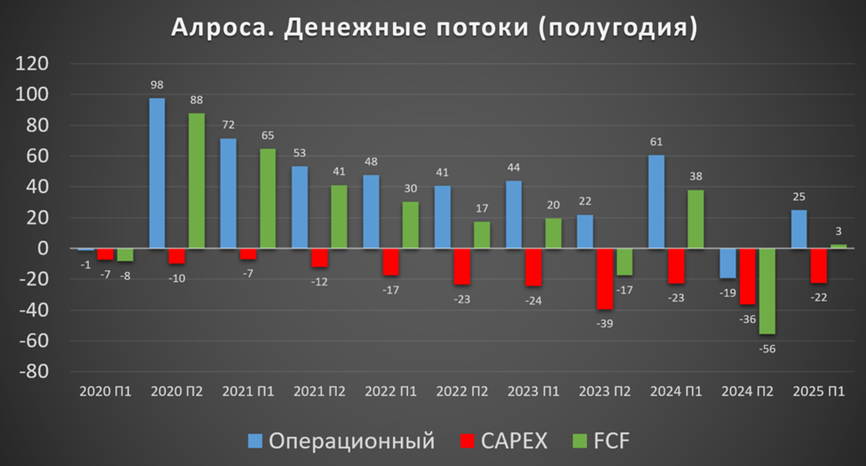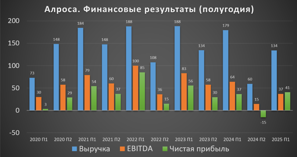 С 2022 года идёт кризис в мировой алмазной отрасли. Операционные результаты компании снижаются. Цены на алмазы падают уже 3,5 года. В итоге, финансовые результаты 1П 2025 слабые, правда, временную поддержку оказала продажа доли в Ангольском руднике. В частности, ЧП выше средней, FCF слегка положительный, чистый долг уменьшился.