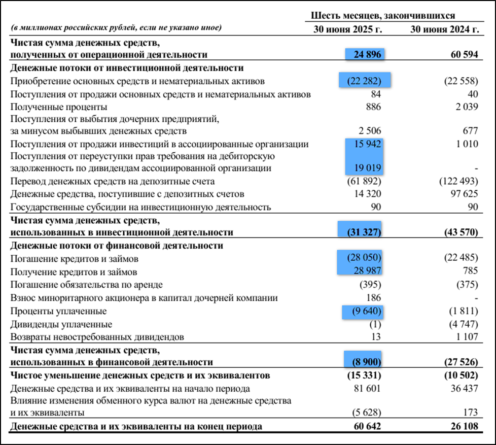 Операционный: +25 млрд (-59% г/г). Огромное падение в основном из-за изменений в оборотном капитале: рост запасов и задолженности покупателей.