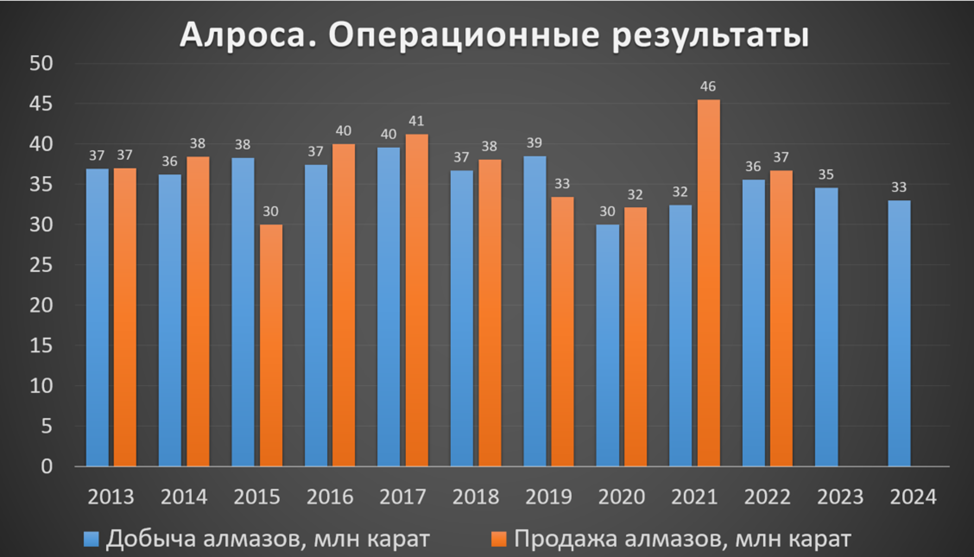 В 2024 году добыча снизилась на 5% г/г и составила 33 млн карат. Это среднее значение за последние 5 лет. При этом компания с 2022 года не публикует информации об объемах продаж.