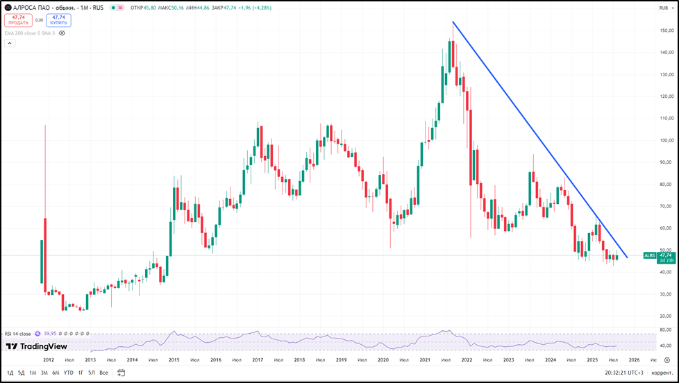 Последние 4 года идёт нисходящий тренд. За это время, со своих максимумов акции упали почти на 70% и находятся вблизи минимумов 2015 года. С начала 2025 года динамика -15%.