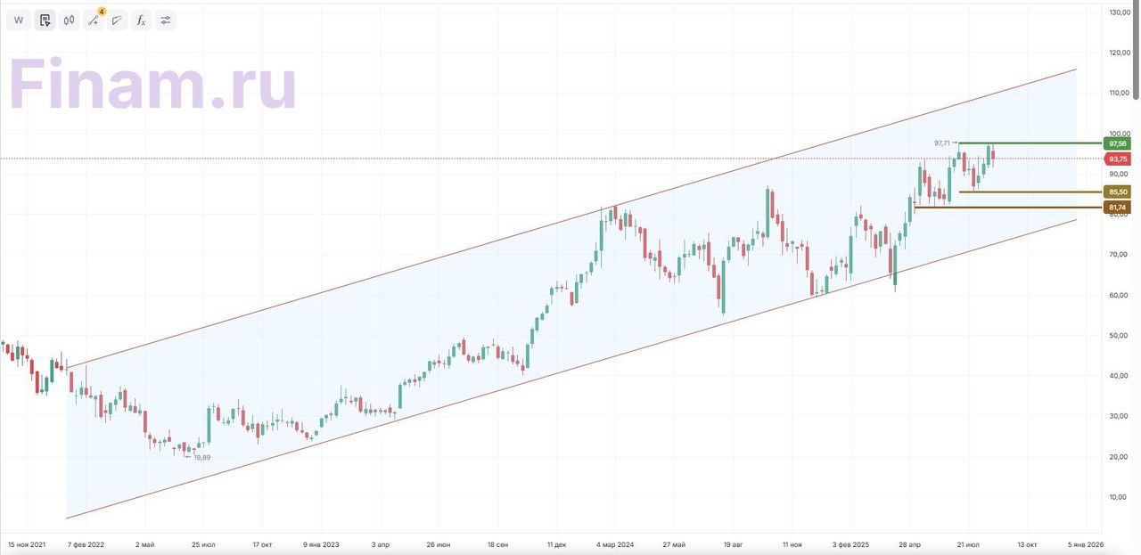 Акции компании движутся в восходящем канале с начала 2022 года. В данный момент котировки протестировали уровень сопротивления $97,6, который является историческим пиком, и начали коррекцию. Уровнями поддержки могут стать $85,5 и $81,74. Целью в случае роста будет выступать верхняя граница канала.