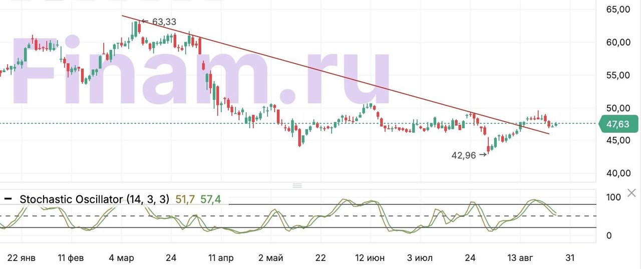На дневном графике акций Bristol Myers недавно был сломлен среднесрочный нисходящий тренд. В перспективе ближайших месяцев потенциал отскока может сохраняться.