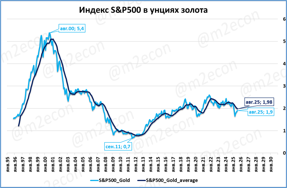 Добавим, что исторический рекорд по индексу достигнут не во всех возможных измерениях. Например, если измерять в унциях золота, то сейчас индекс (переведённый в доллары) «весит» менее двух унций (1,9) золота.