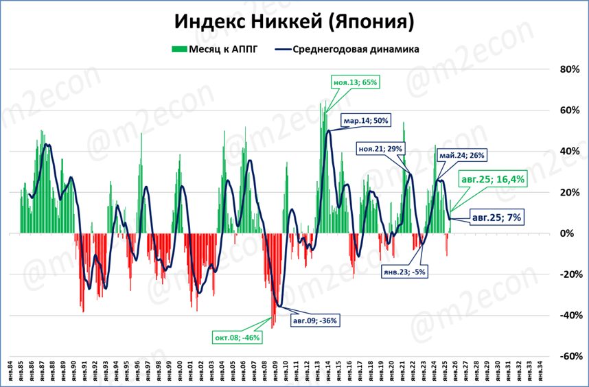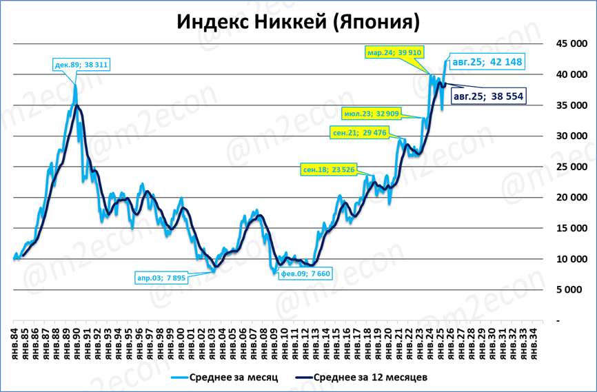 Японский индекс Никкей в августе составил 42,1 тыс. пунктов (+16,4%). Это новый исторический рекорд.