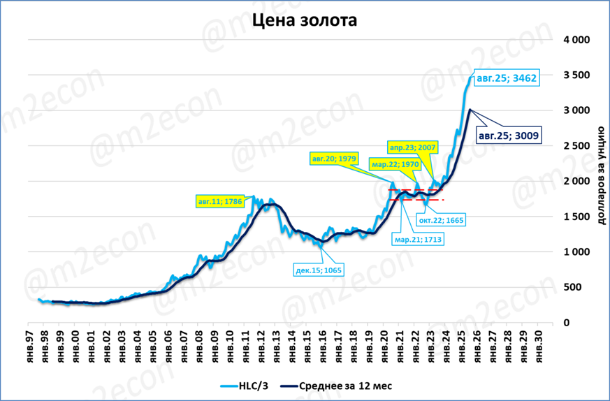 Цена золота в августе составила 3 462 доллара за унцию. Это +38% к августу прошлого года и новый исторический рекорд.