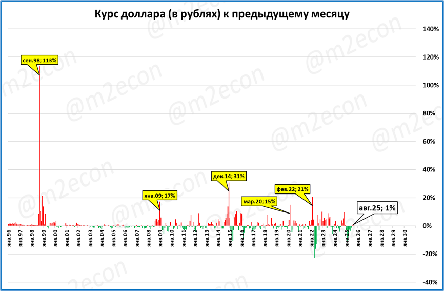 Резкие скачки курса (>15% к предыдущему месяцу) показаны жёлтыми выносками.