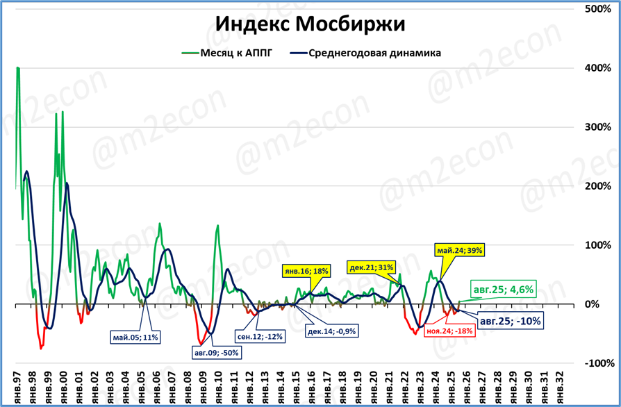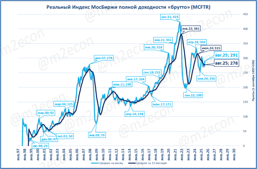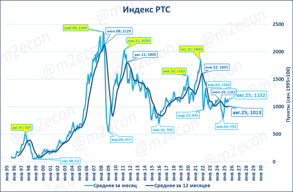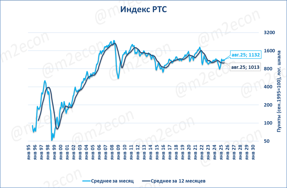 Индекс Мосбиржи в августе составил 2 879 пунктов, (+4,6% годовых). Это первый месяц роста после 12 месяцев падения подряд. Локальным дном стал ноябрь 2024.