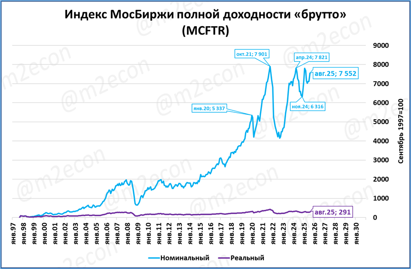 В реальном выражении (с корректировкой на инфляцию) рост индекса полной доходности намного скромнее, в 2,9 раза (фиолетовая линия на графике).