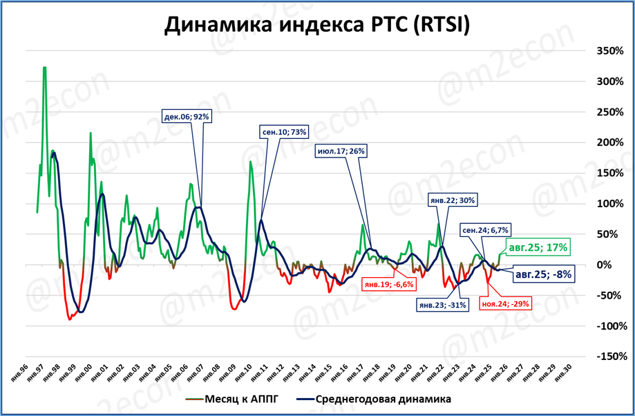 Сейчас индекс РТС на 17% выше, чем в августе прошлого года.