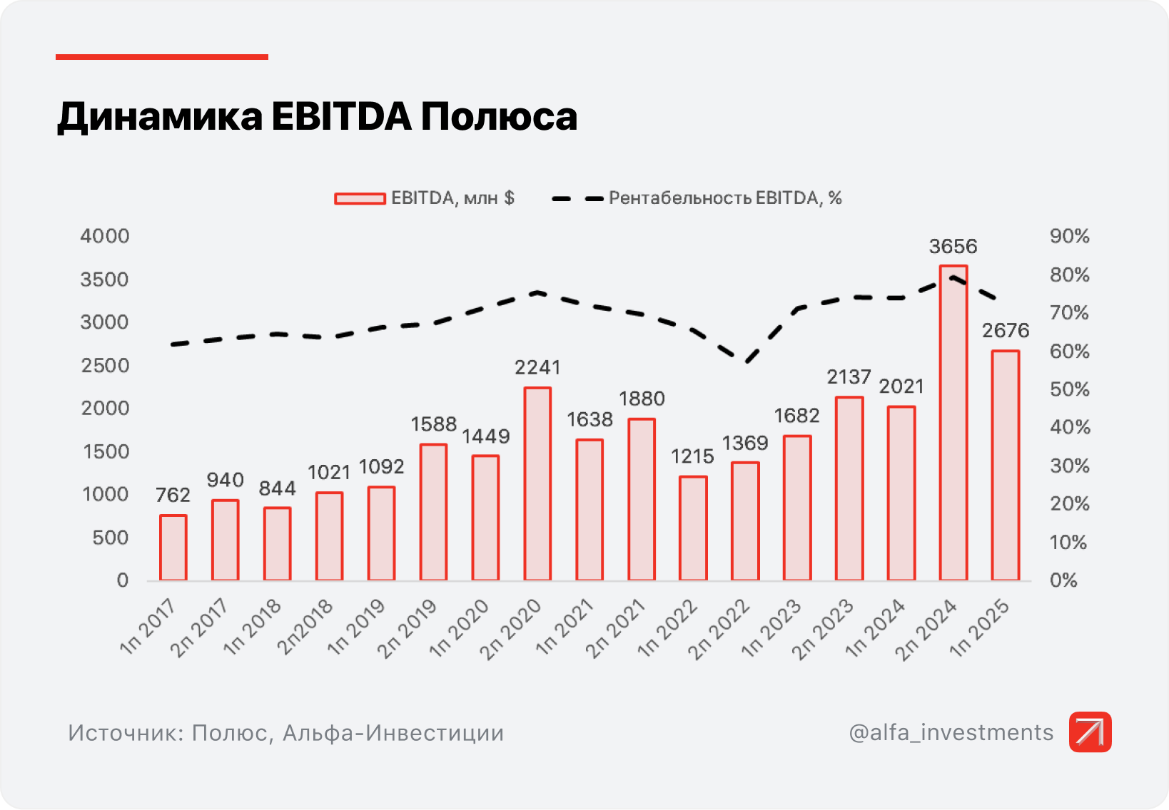 Результаты Полюса за I полугодие 2025 года вышли на уровне ожиданий. Продолжающийся рост цен на золото позволил компании нарастить выручку на 35%, а EBITDA — на 32% к аналогичному периоду прошлого года.