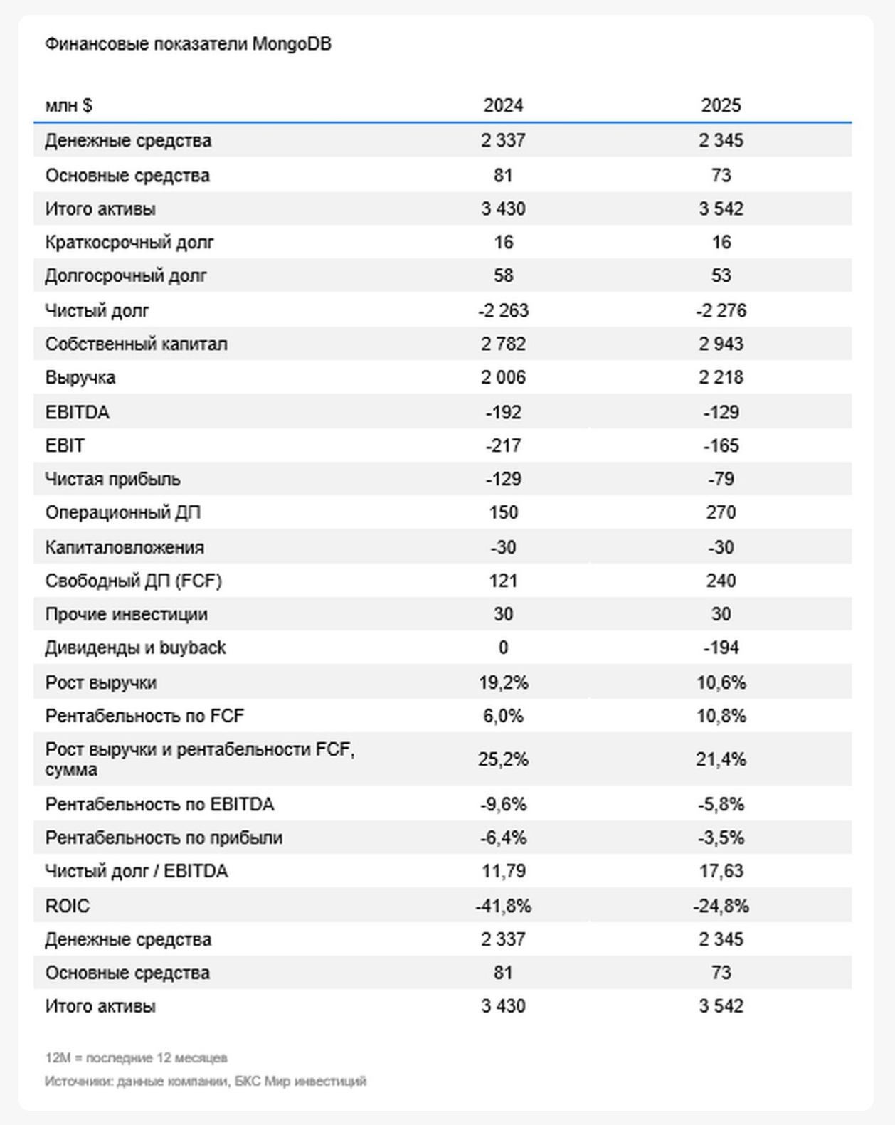 Бизнес MongoDB сильно зависит от макроэкономической конъюнктуры ввиду фокуса на малый и средний бизнес. В то же время MongoDB постепенно переориентируется в сторону крупных компаний, что снизит волатильность финансовых показателей в период макроэкономической неопределенности. Около 70% выручки приходится на продукт Atlas (для облачных систем). Используется бизнес-модель, которая предполагает взимание платы за объем потребления. Ввиду замедления деловой активности (и сокращения объемов использования продукта Atlas) компания столкнулась с замедлением роста выручки. Сказывается и тренд на смещение расходов с традиционного ПО в пользу продуктов на базе ИИ. Ожидается, что по итогам 2026 финансового года темпы роста общей выручки снизятся до +17% к аналогичному показателю прошлого года (г/г). В 2025 г. рост составил 19%, в 2023 г. — 31% г/г. Динамика продукта Atlas оценивается в +23% г/г (в 2025 г. +27%, в 2023 г. +37% г/г). Ожидаем рост выручки в 2025-30 гг. со среднегодовым темпом 16%, что будет обусловлено расширением основных продуктов компании, Atlas и EA (решения для крупного бизнеса). С точки зрения финансовой устойчивости, у MongoDB отрицательный чистый долг, что говорит о низкой долговой нагрузке. В то же время компания является убыточной на операционном уровне по GAAP и активно размывает акционерный капитал: текущая компенсация сотрудникам в виде акций составляет 27% от выручки, а к 2030 г. при текущем уровне таких выплат ожидается увеличение числа акций в обращении на 20%.