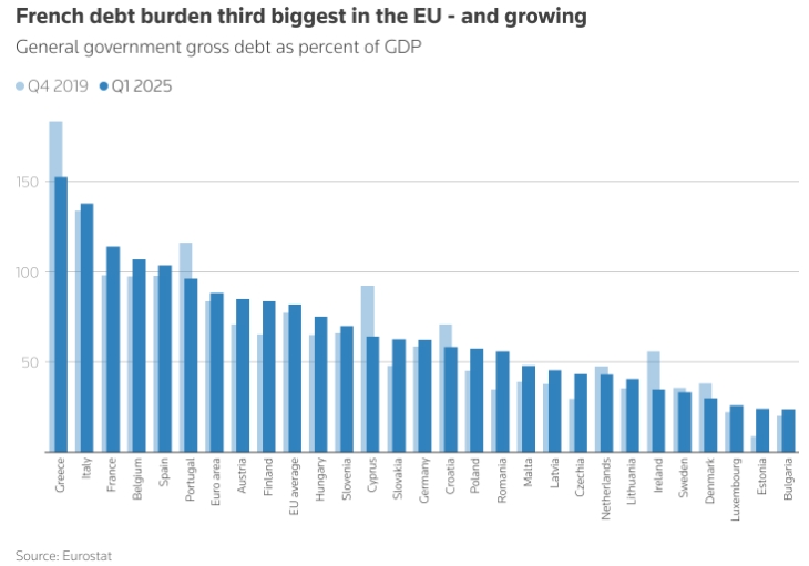 Крах последнего правительства Франции усугубляет положение второй по величине экономики еврозоны, погружая её в пучину слабого роста, высокой стоимости заимствований и увеличивающегося долгового бремени, одного из самых тяжёлых в Европе.