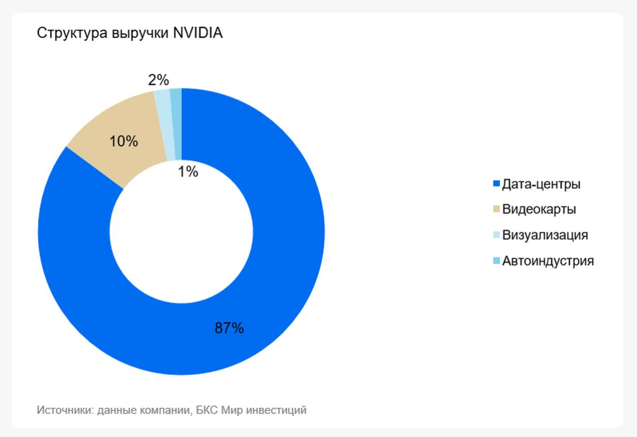 NVIDIA (NASD: NVDA) разрабатывает микросхемы для графических процессоров. Компания представлена в пяти сегментах: дата-центры (дизайн микросхем для анализа данных, обработки графики, искусственного интеллекта), игровой сегмент (видеокарты для ПК), визуализация, сегмент чипов для автопрома (системы автономного вождения) и разработки для производителей ПК. Продукция NVIDIA производится на заводах TSMC, Samsung, Micron и других. Заказчиками выступают производители ПК (Dell, HP, Lenovo) и пользователи облачной инфраструктуры (Amazon, Alphabet, Microsoft).