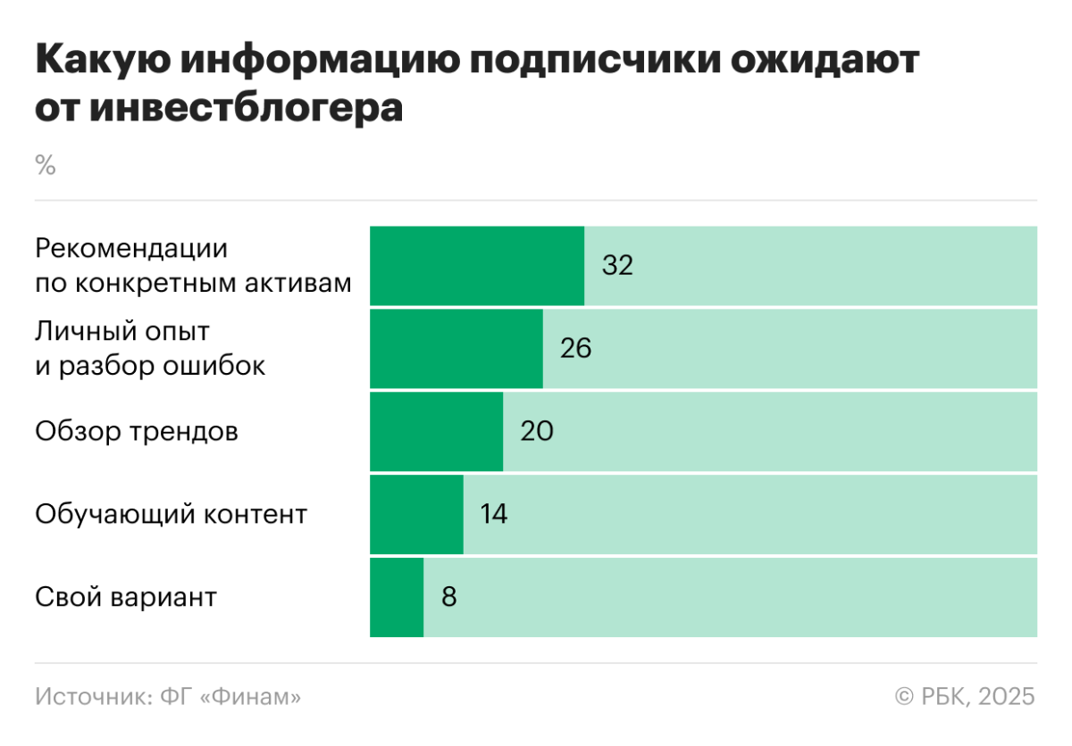 Что касается ожиданий от инвестиционных блогеров, то 32% респондентов в первую очередь интересуются рекомендациями по конкретным активам, 26% ценят личный опыт и разбор ошибок, 20% ожидают обзоры трендов, а 14% — обучающий контент.