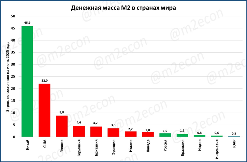 Россия, вторая страна БРИКС по объёму денежной массы, отстаёт от Китая в 30 раз!