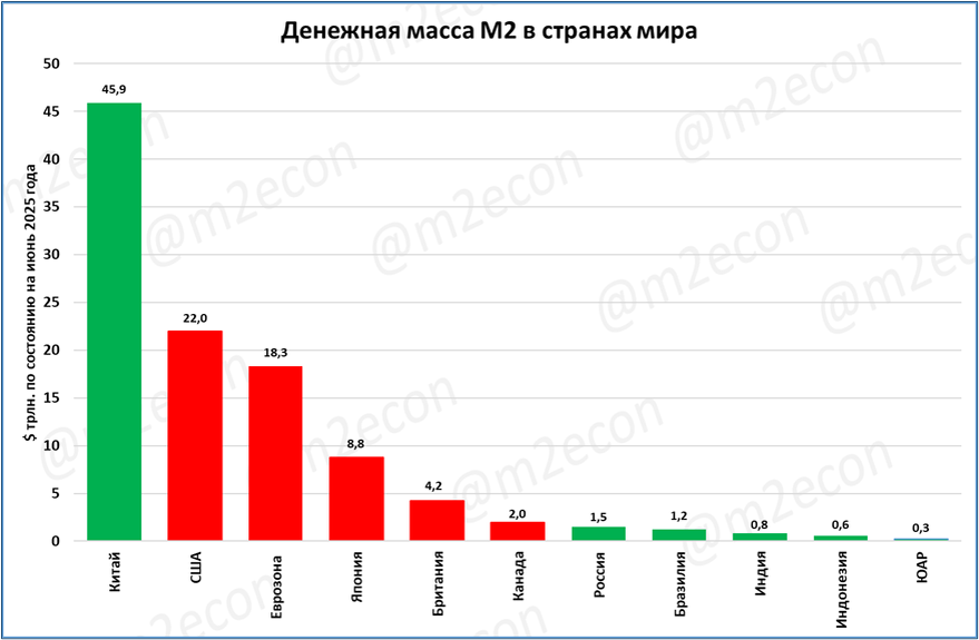 Если посмотреть денежную массу по странам, то становится очевидно, что всем этим успехом страны БРИКС обязаны Китаю.