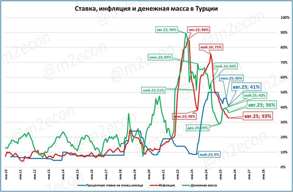 Денежная масса в Турции в августе выросла на 36% годовых.