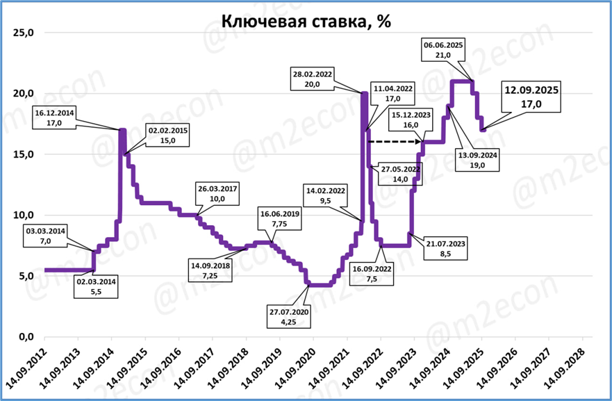 12 сентября ЦБ снизил ставку с 18 до 17% годовых.