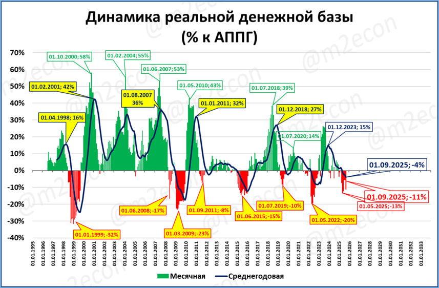 На 1 сентября денежная база (27 трлн руб.) даже в номинальном выражении показала падение (-4,1%). С учётом инфляции, то есть в реальном выражении, падение ещё более сильное, -11%.