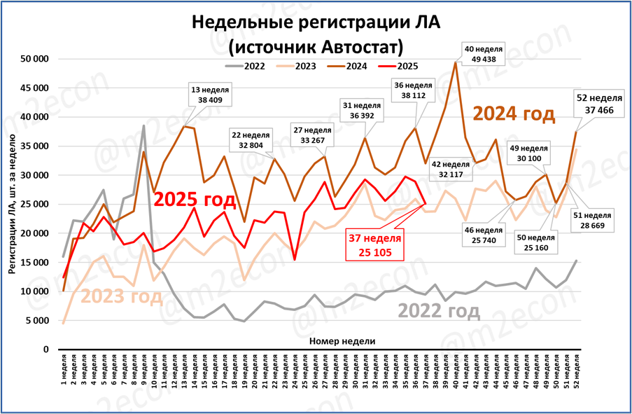 По данным агентства «Автостат», регистрации легковых автомобилей на 37 неделе составили 25,1 тыс.