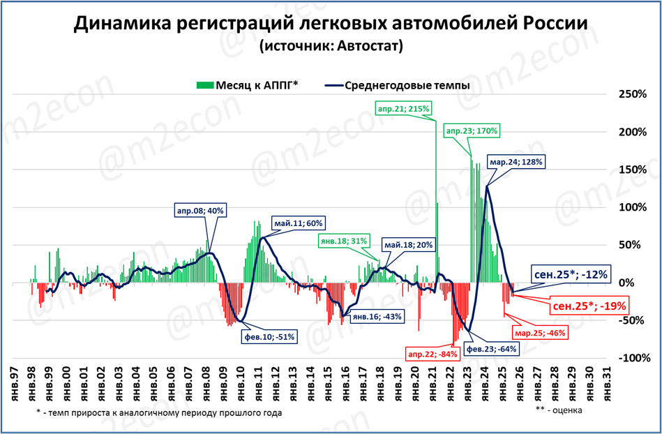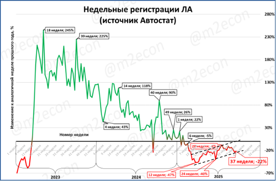 Худшей динамика была на 12 неделе (-47%). С тех пор она постепенно улучшается. Учитывая всплеск регистраций в сентябре октябре прошлого года (из-за утильсбора), динамика может временно ухудшиться в эти месяцы года нынешнего. Но в ноябре-декабре она вновь, по нашим оценкам, вернётся в коридор (пунктирные линии на графике).