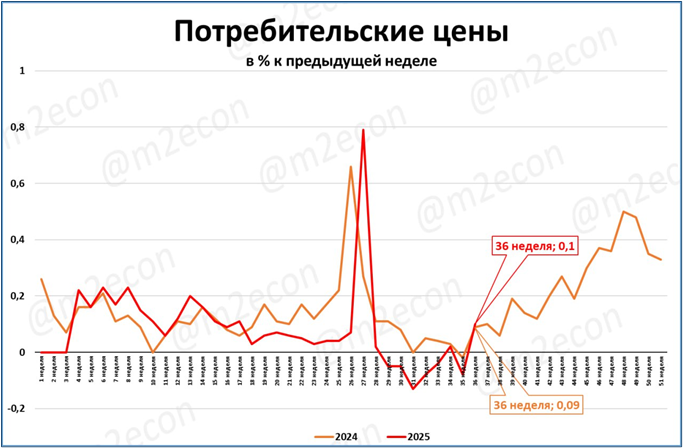 За 36 неделю цены выросли на 0,1%. Это выше, чем за 36 неделю прошлого года (0,09%).
