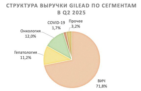 По итогам 2К 2025 выручка Gilead Sciences выросла на 2% по сравнению с аналогичным периодом прошлого года и составила $7,08 млрд, превысив ожидания на $120 млн. Продажи препаратов для лечения ВИЧ увеличились на 7% г/г и достигли $5,09 млрд. Выручка от препаратов для лечения заболеваний печени снизилась на 4%, до $795 млн. Продажи противораковых препаратов выросли на 1% и составили $849 млн.