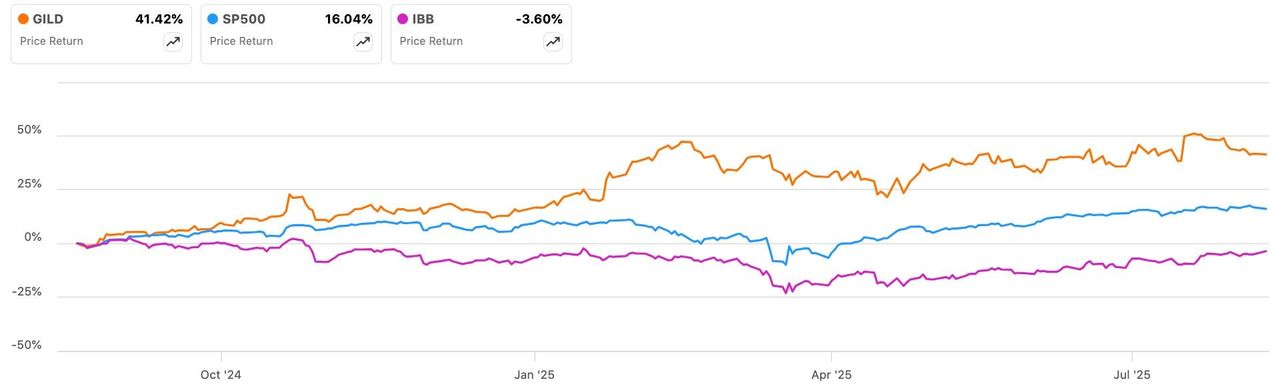 За последние 12 мес. акции Gilead Sciences значительно опередили по доходности и биотех, и американский рынок в целом. Gilead нарастила 41% рыночной капитализации, тогда как индекс S&P 500 ушел в плюс на 16%, а отраслевой индексный фонд iShares Nasdaq Biotechnology ETF просел на 4%.