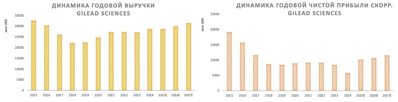 В 2024 г. Gilead Sciences увеличила выручку на 6%, до $28,8 млрд, за счет роста продаж в сегментах ВИЧ, онкологии и заболеваний печени. Чистая прибыль составила $480 млн, значительно снизившись по сравнению с $5,61 млрд в 2023 г., это связано с крупными единовременными расходами на приобретение фирмы CymaBay. Скорректированная чистая прибыль Gilead уменьшилась на 31% г/г, до $5,80 млрд.