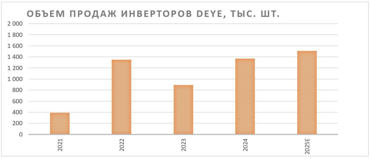 Ключевое направление для Ningbo Deye Technology — продажа инверторов. Инвертор необходим на каждой солнечной электростанции, домашней и промышленной, что приводит к росту спроса на инверторы на фоне развития солнечной энергетики в Китае и развитых странах. На этом фоне по итогам 2024 года продажи инверторов Deye увеличились более чем на 50% г/г, до 1,4 млн шт. Ожидаем, что на фоне растущего спроса и ввода дополнительных производственных мощностей рост продаж продолжится, хотя и более низкими темпами, чем в 2024 году. В частности, в первом полугодии 2025 года продажи выросли на 7,3% г/г.