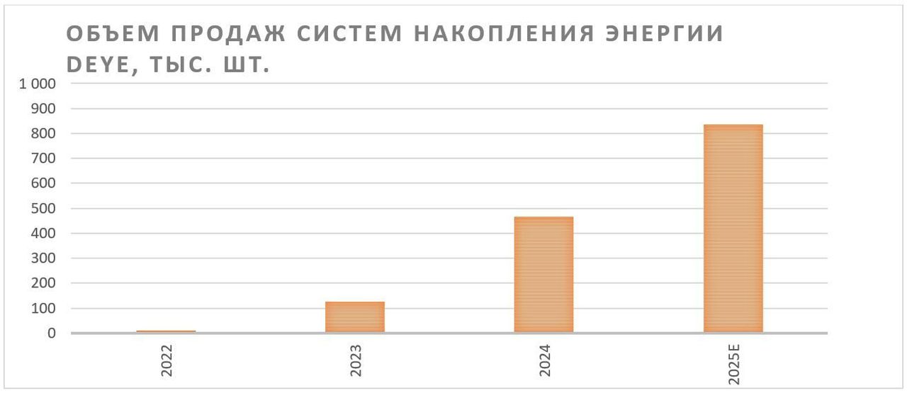 Наиболее растущее направление бизнеса Ningbo Deye — производство и продажа систем накопления энергии, которые используются как на домашних, так и на промышленных солнечных электростанциях, причем в последние годы компания активно расширяет присутствие в промышленном сегменте. Солнечная генерация является нестабильной из-за погодных условий, в связи с чем тема накопления энергия все более актуальна для отрасли. На этом фоне по итогам 2024 года Deye нарастила продажи систем накопления энергии в 3,6 раза г/г.